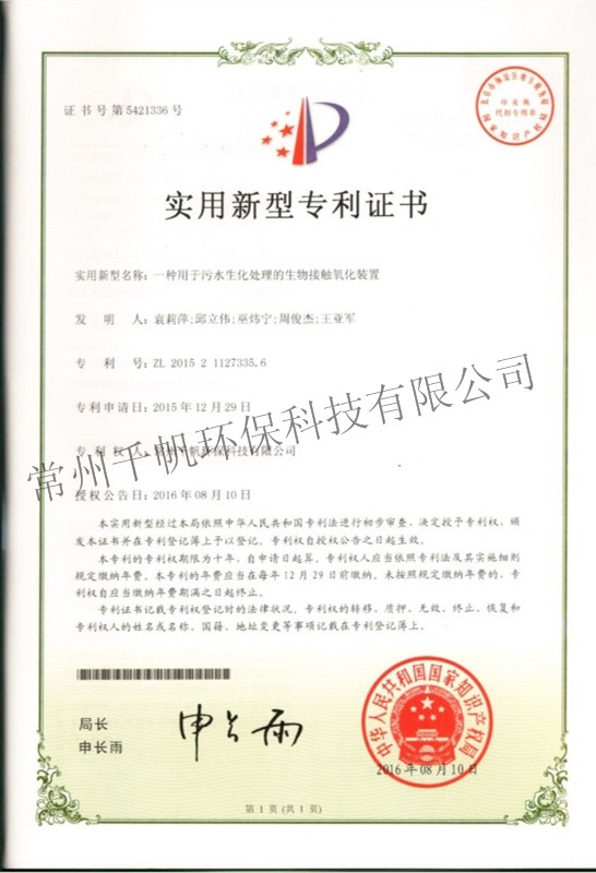 实用新型专利证书 一种用于污水生化处理的生物接触氧化装置
